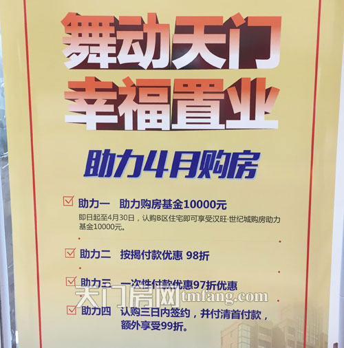 舞动天门,幸福置业,助力4月购房优惠:助力一:助力购房基金10000元;即日起至4月30日,认购B区住宅即可享受汉旺·世纪城购房助力基金10000元。助力二:按揭付款优惠98折;助力三:一次性付款优惠97折;助力四:认购三日内签约,并付清首付款,额外享受99折。...[阅读全文]
