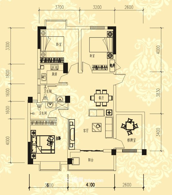 户型解析 气派的四房设计,严谨的干湿的动静区分隔,让家庭生活秩序井然;独立娱乐室设计,生活之中更添欢乐气息;厨房明亮方正,功能齐全;超大客厅设计,更增添了一份雍容的生活感受。