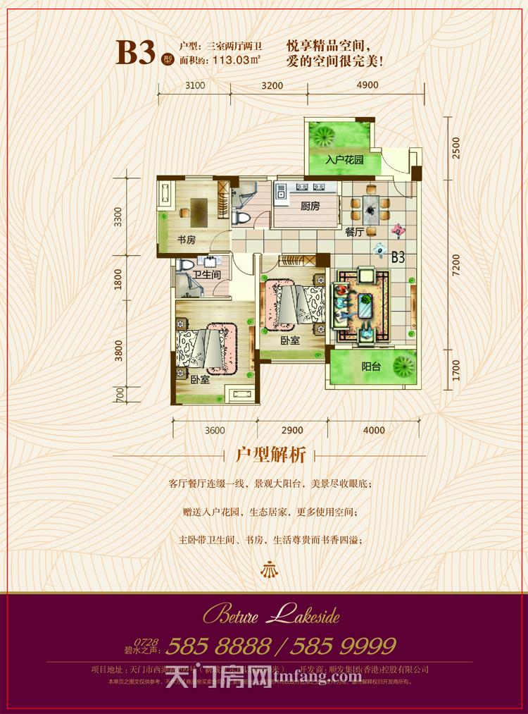 户型解析 悦享精品空间,爱的空间很! 客厅餐厅连缀一线,景观大阳台,美景尽收眼底; 赠送入户花园,生态居家,更多使用空间; 主卧带卫生间、书房,生活尊贵而书香四溢。