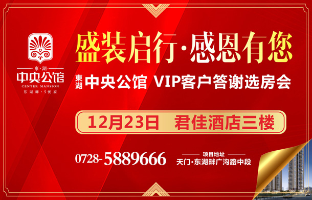12月23日,东湖畔5优家优质好房东湖·中央公馆即将盛装启行,VIP客户答谢选房会在君佳酒店三楼隆重举行,好房源错过不再有,你还在等什么?...[阅读全文]