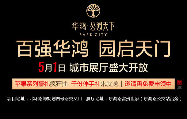 5月1日,华鸿·公园天下城市展厅盛大开放,活动当天苹果系列豪礼疯狂抽,千份伴手礼来就送,不可错过的城市狂欢,期待百强华鸿,园启天门!...[阅读全文]