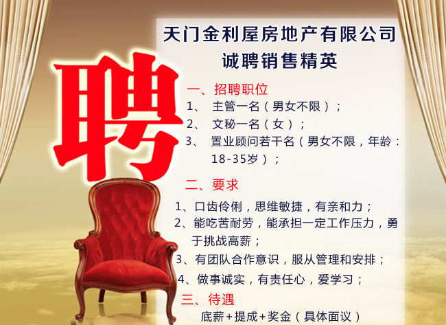 天门金利屋房地产有限公司成立于2009年,地处天门市竟陵东湖路38号,目前主要经营房地产开发。现因发展需要,面向社会公开招聘销售精英。...[阅读全文]