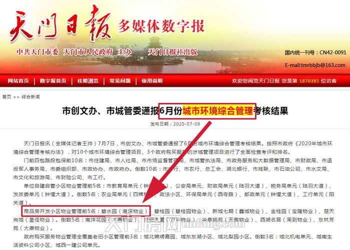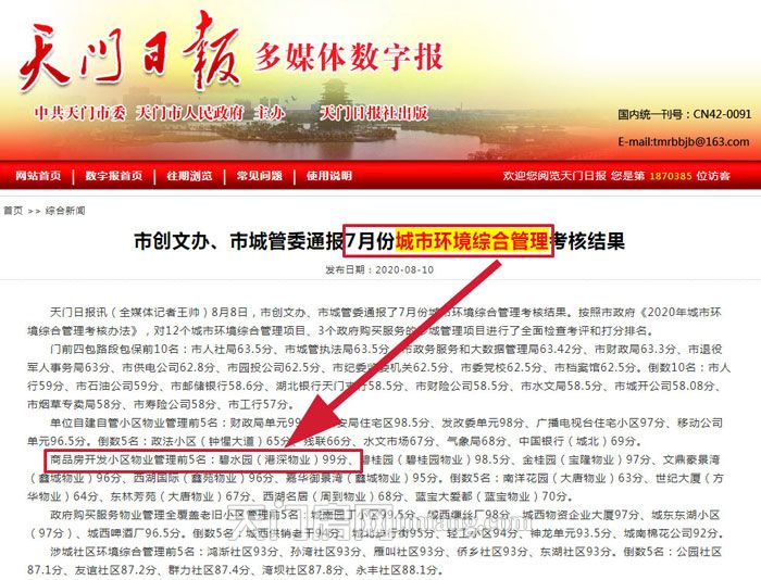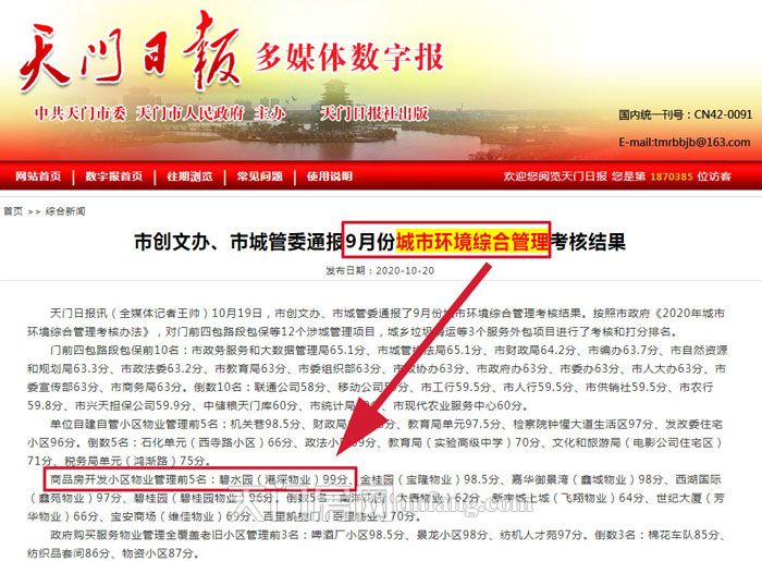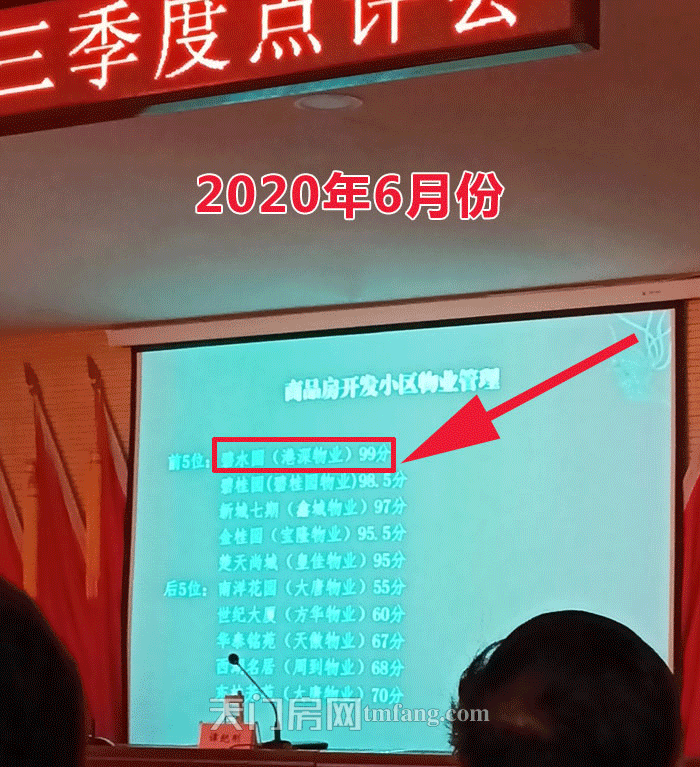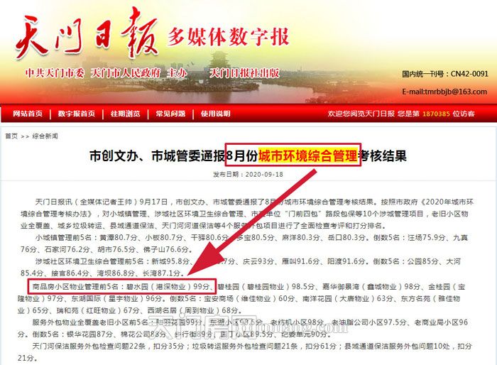 2020年11月13日,天门市城市环境综合管理考核第三季度点评会召开,会议组织与会人员观看了城市环境综合管理6至10月考核情况通报PPT,对考核排名靠前以及落后的单位进行了通报,期中由顺发地产匠心打造的碧水园项目的小区物业“港深物业“捷报频传,受到了市领导和业主们的高度认可和肯定。