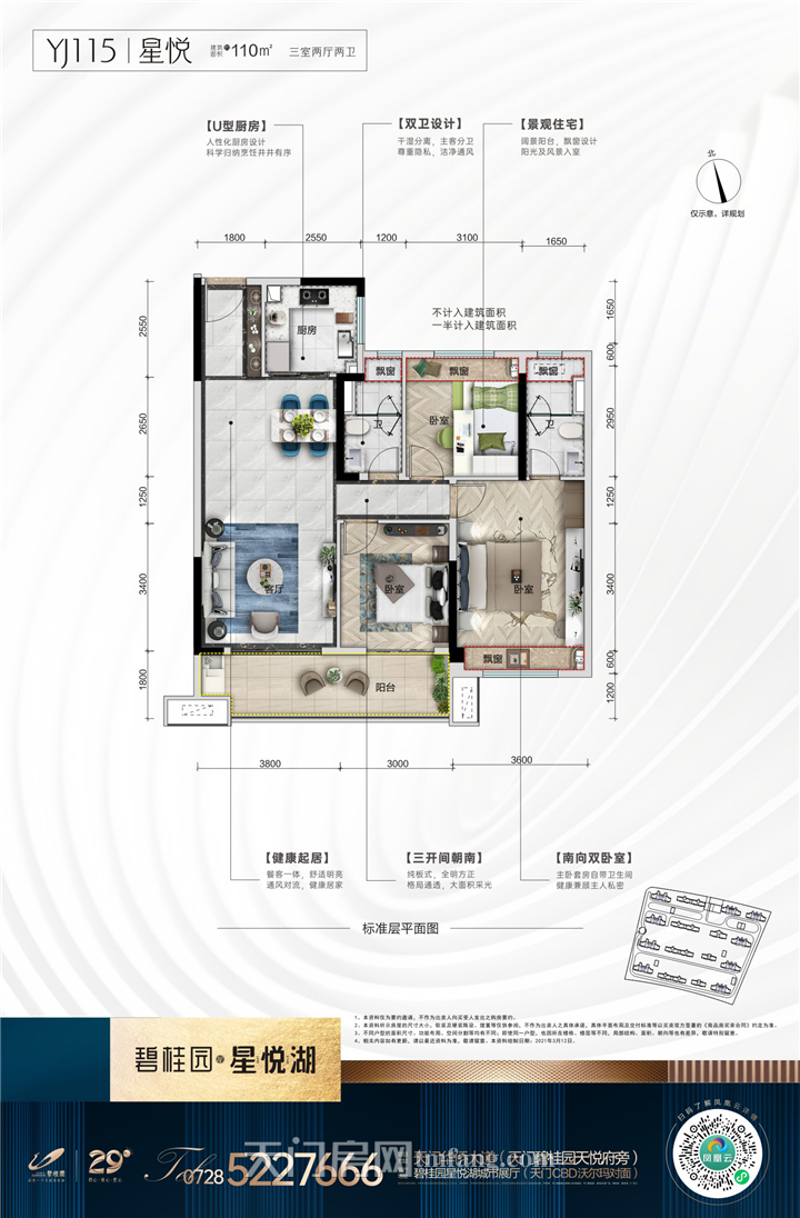 YJ115户型方正,多开间朝南的设计,通风采光俱佳。动静分区设计,共处一室而互不干扰,餐、客、厨、阳台一体化,居家待客优雅从容。