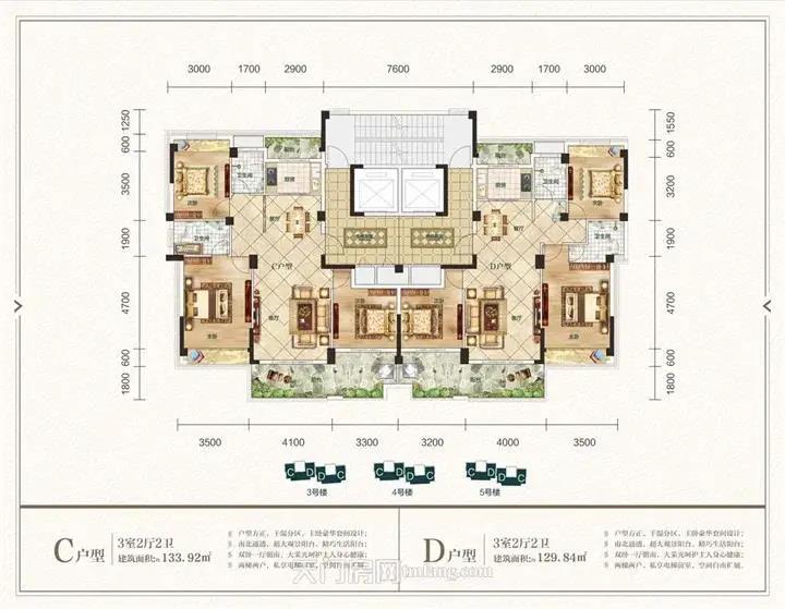 /建面约129.84㎡、133.92㎡三室二厅二卫