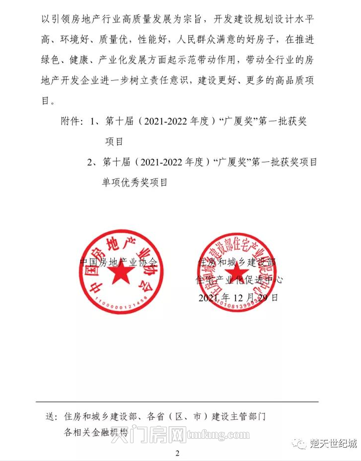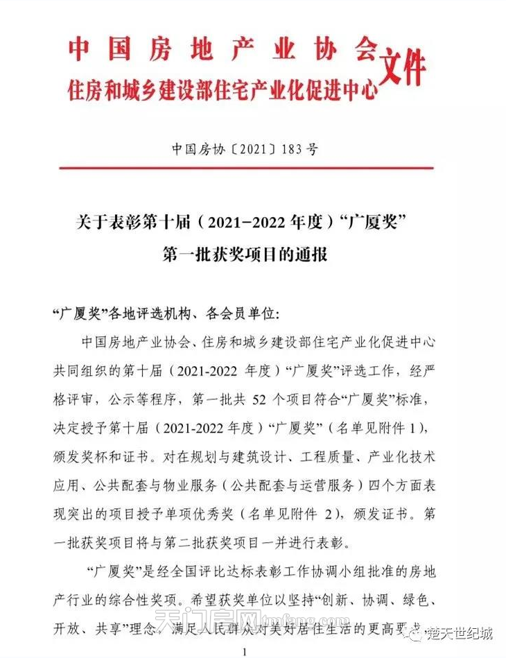 12月29日,第十届(2021-2022年度)中国房地产“广厦奖”第一批获奖项目名单正式公布。楚天世纪城项目凭其过硬的综合品质,在一众项目中脱颖而出,荣膺中国房地产“广厦奖”和国家二星级绿色建筑。全国仅有52家获此殊荣。
