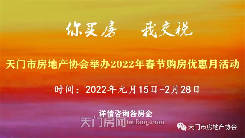 为积极消解疫情影响,解决购房者购房难的问题,天门市房地产协会举办2022年春节购房优惠月活动。