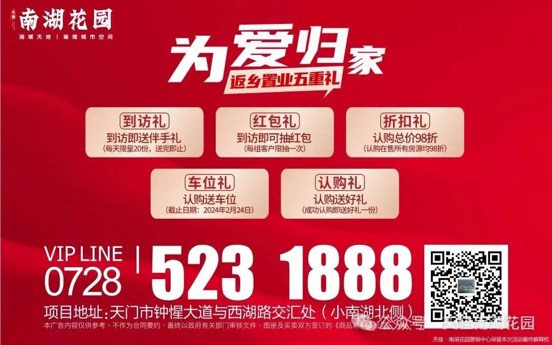 天佳·南湖花园自入市以来,备受广大购房者的关注与厚爱,2024年1月1日开盘,即受到热捧,去化近百套,红遍全天门。
