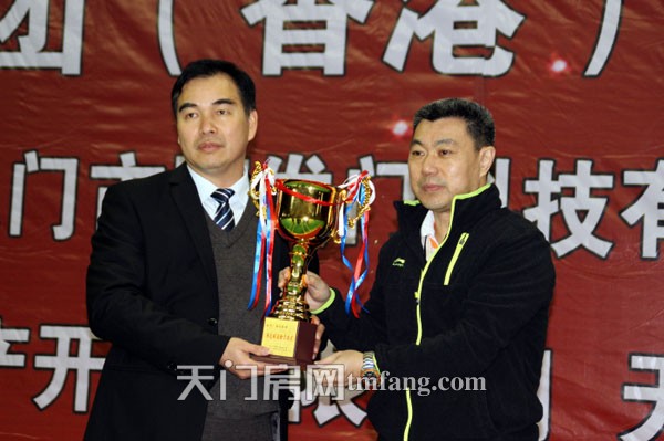 顺发集团代表陈总给陈跃颁发“羽毛球运动贡献奖”