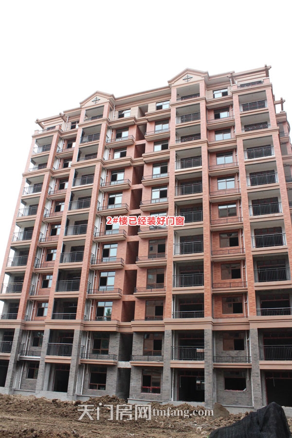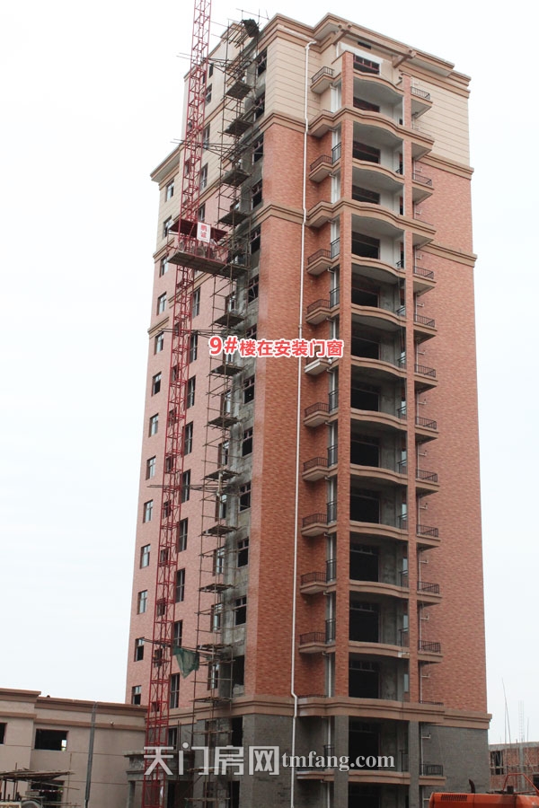 位于东边的9#楼还剩下后一点的外立面贴砖,同时在安装门窗的工程。