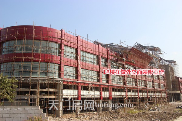 1#楼正在做外立面的装饰工作,玻璃窗户都已经安装好,外墙快完工
