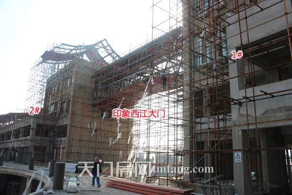 印象西江·天街项目的大门入口处,1#、2#和大门的内部都正在安装玻璃窗户,内侧外立面准备贴砖。