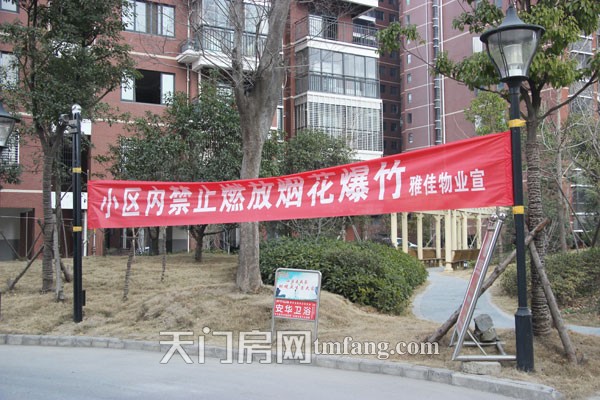 小区入口处很显眼的地方挂着物业的宣传横幅,为了迎接新年的到来给大家营造一个安全的小区环境欢度春节,物业温馨的提示小区内禁止燃放烟花爆竹。