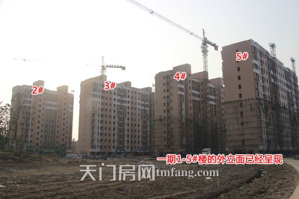一期1-5#楼的外立面已经呈现,4#、5#楼的脚手架正在拆除