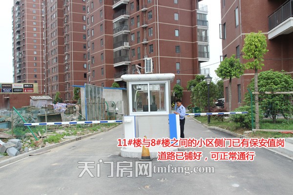 11#楼与8#楼之间的小区侧门已有保安值岗,道路已铺好,可正常通行
