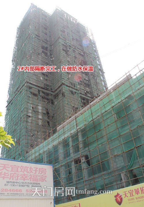 新工程进度:天宜华府一期预计11月28日交房,1#和2#内部隔断已完工,正在做内墙抹灰和保温防水;3#内部隔断即将完工;4#内部隔断完工,正在拆除脚手架和防护网;9#和11#窗户已全部安装完毕,正在安装玻璃。二期已经动工,正准备打桩。