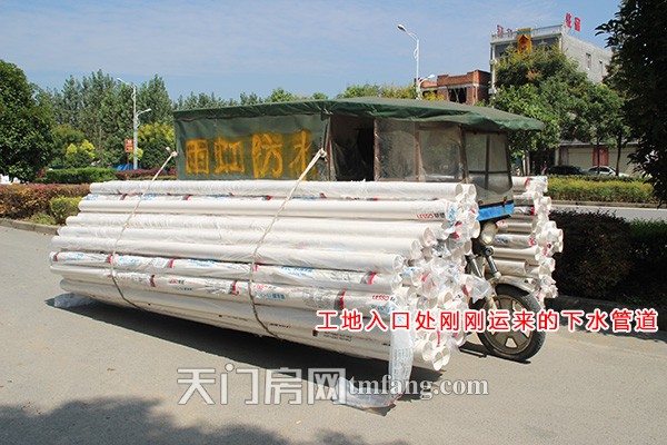 鑫龙·中央公园工地入口处停放的刚刚运来的下水管道,即将开始安装