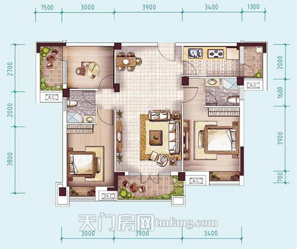 次卧(二)带有小阳台,可以结合实际需要设计成书房