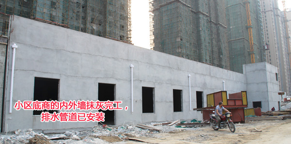 这里是3#楼、4#楼、5#楼的内部底商,内外墙已经抹灰完工,外墙上的排水管已安装。