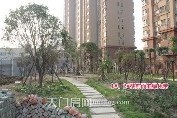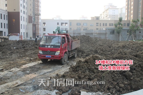 1#楼和2#楼前方在填土准备铺路和继续完善绿化带建设