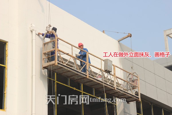 工人在做外立面抹灰、画格子