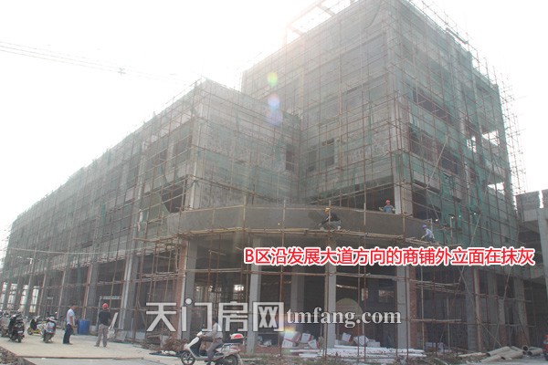 B区沿发展大道方向的商铺外立面在抹灰