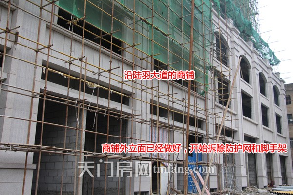 商铺的外立面已经做好,开始拆除防护网和脚手架