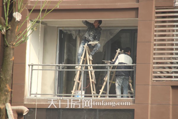 13#外墙真石漆施工接近尾声,正做内墙粉刷。