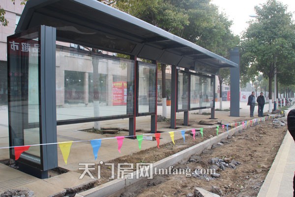 小区外的公交站正在建设中,沿途有8路公交经过。