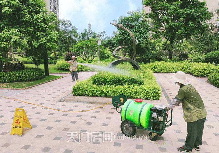 浇灌着区里的花草树木
