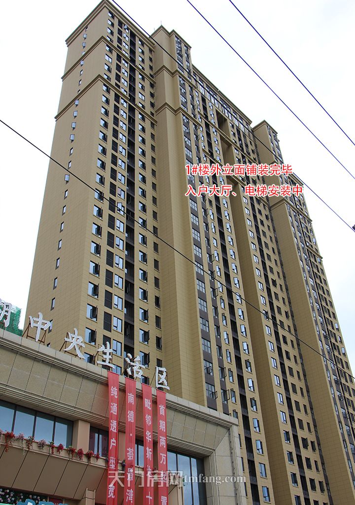 ▲1号楼外立面铺装完毕,入户大厅,电梯安装中