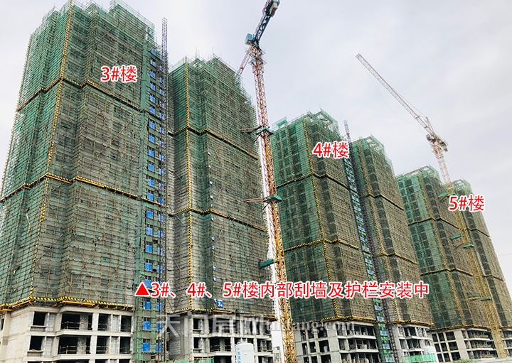 ▲3号楼、4号楼、5号楼内部刮墙及护栏安装中