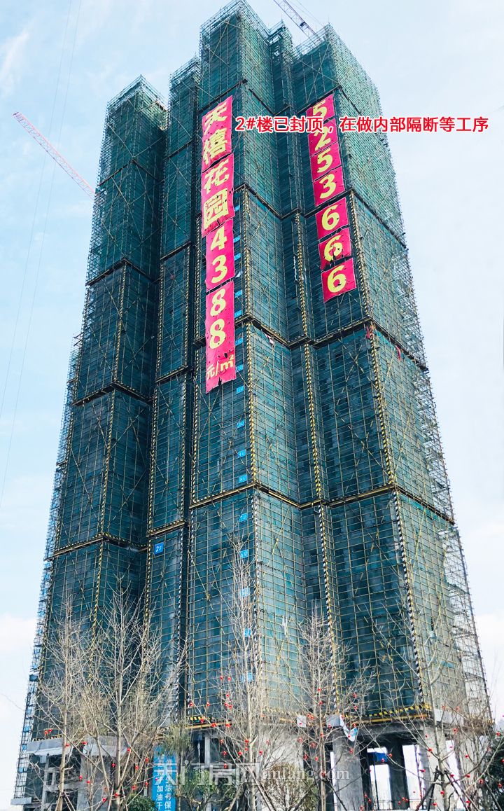 3月工程进度:天禧花园1#楼、2#楼、3#楼已经封顶,正在做内部隔断等工序;11#楼在建21层;12#楼在建20层。