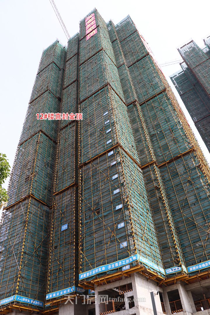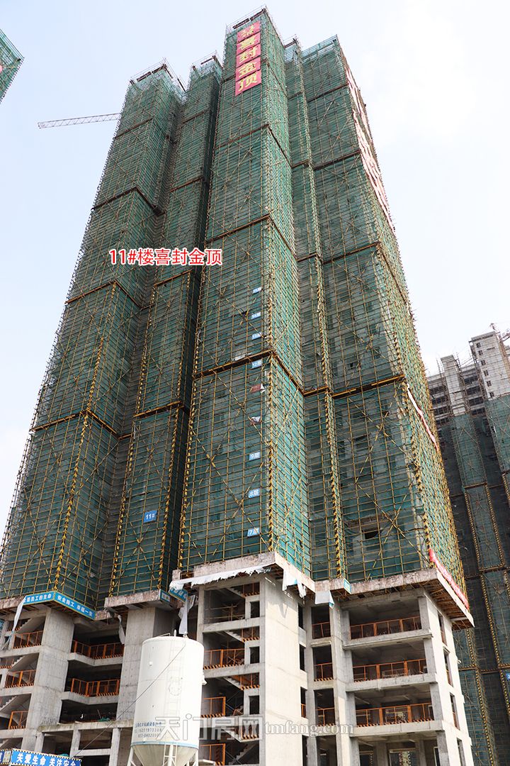 6月工程进度:天禧花园1#楼正在安装窗户、阳台栏杆;2#正在安装窗户、阳台栏杆;3#楼正在做内外墙粉刷工序;1#、2#、3#号楼即将安装电梯;11#楼、12#楼喜封金顶!
