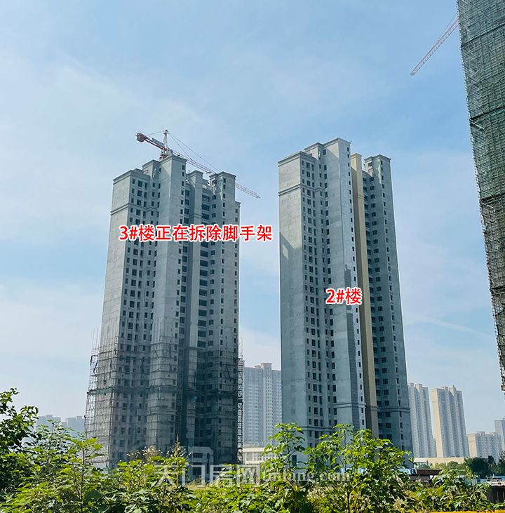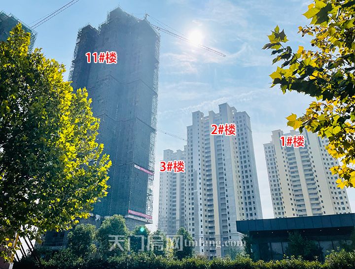 10月工程进度:天禧花园1号楼、2号楼的外立面正在施工中;3号正在拆除脚手架;11号楼、12号楼在做内外墙抹灰工序!