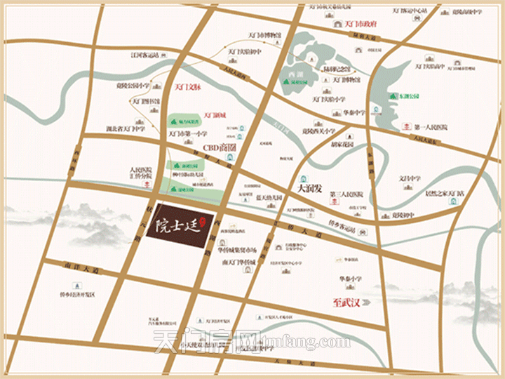 天门富力院士廷,项目占地7.9万方,建筑面积25.8万方,容积率2.8,绿化率35%,总户数1671户,由3幢洋房和10栋高层组成。位于天门城南交通枢纽十字轴,东临西湖路、西临状元路、北临汇侨大道。坐拥天门沃尔玛,大润发两大商圈,紧邻人民医院汇侨分院,周边教育资源丰富,天门中学、天门一小、天门幼儿园、天宜国际中学、枫华国际幼儿园、开发区小学都在附近,上学便利。