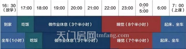 孩子在路上的时间,抢占的是睡觉的时间。有相关调查显示:儿童睡眠少于8小时的,有61%的功课较差;而睡眠达到10小时的,76%成绩达到中等,11%成绩优良。如图所示,可以直观感受到离家近对孩子学习的重要性,路上多走1分钟,孩子就少睡1分钟。