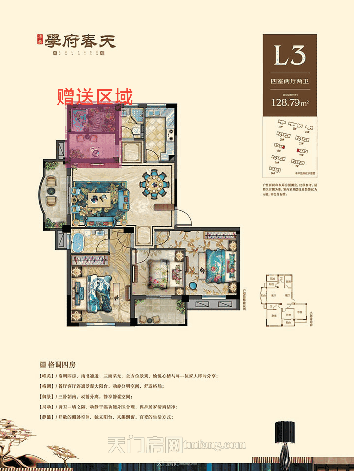华泰学府春天,兼具首改和终改全阶段,在设计上很下功夫,建面约128㎡的户型,买三房得大四房、赠送面积让人惊喜。
