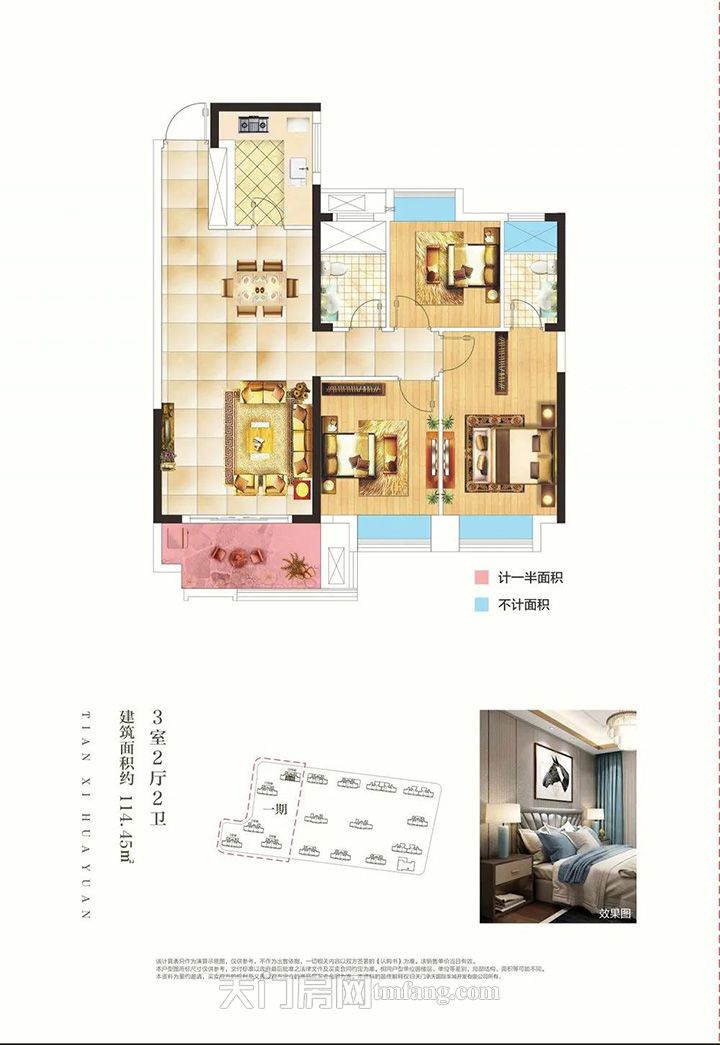 天禧花园建面约128.75㎡全明户型,三开间朝南,轻松接收阳光和鲜氧。大面宽,大客厅、双卧均可享受阔绰的朝南面,加上宽阔景观阳台,南北对向流通,良好的通风24小时焕新室内空气,时刻呵护居者的健康。