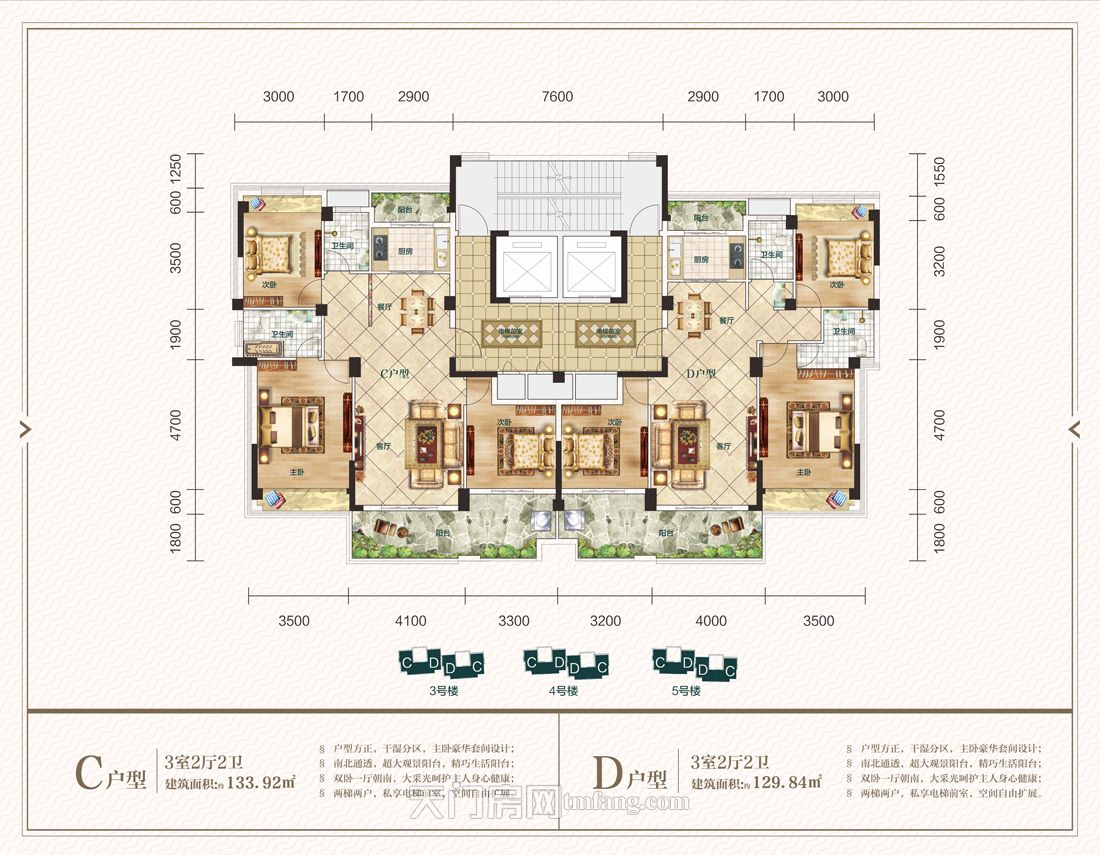 高私密性的卧居区域,动静合理分区,互不干扰彰显舒畅,让家洋溢沟通、关爱和理解的快乐时光。空间的宽境尺度,满足全家舒居想象。