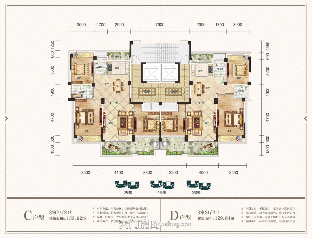 方正的户型,布局巧妙,无浪费空间。横厅大开间设计,采光面宽,视野更加开阔。