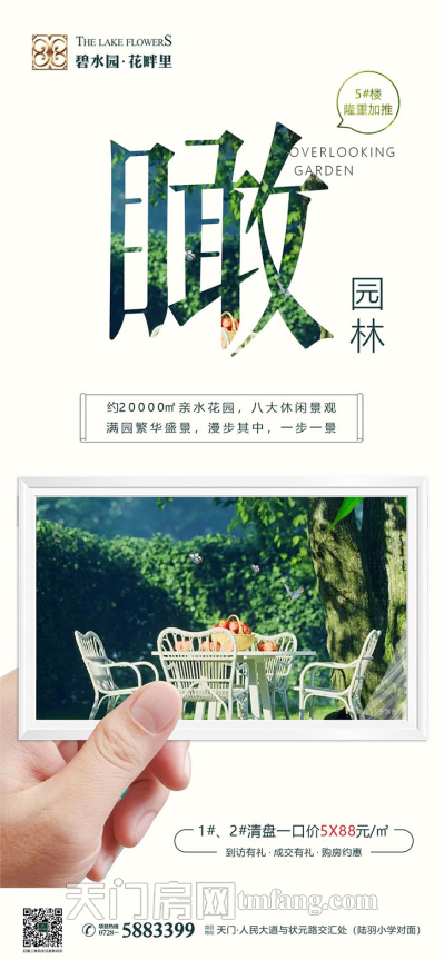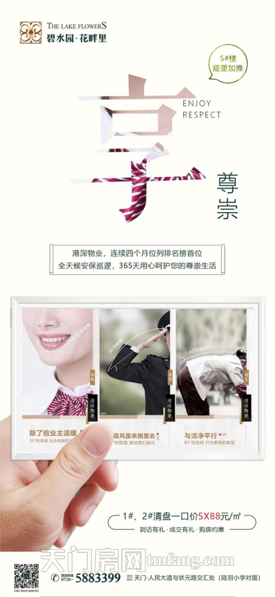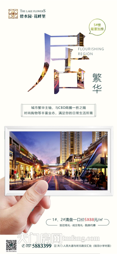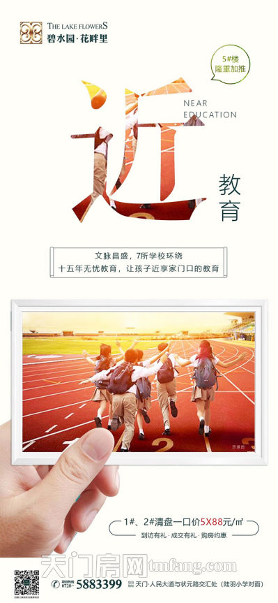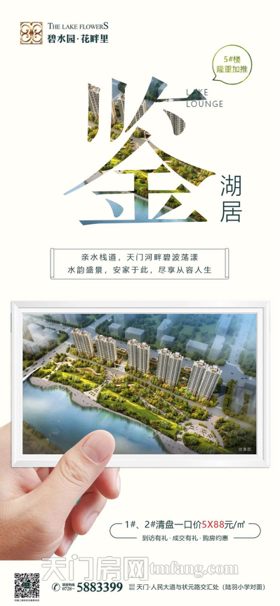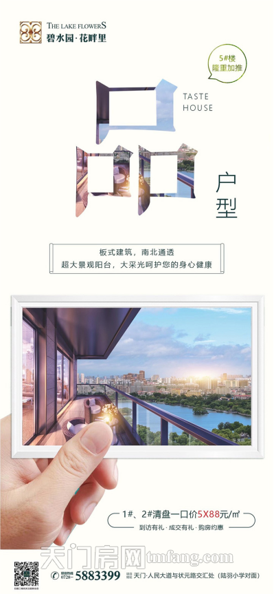 碧水园·花畔里位于城市主干道人民大道与状元路交汇处,南面一线临天门河,与天门CBD商圈一桥之隔。占据城市中芯腹地,奢享水岸生态走廊,所有住宅全为两个单元,一梯一户,纯正板式结构,南北通透双阳台,全赠送私家入户花园。