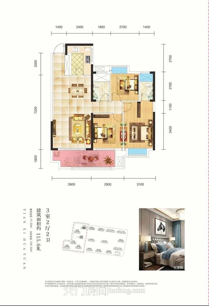 天禧花园整个项目建筑面积320605.76平米,占地面积84153.81平米,综合容积率仅为3.27,绿化率30%以上,由16栋高层组合而成、一期建筑面积为115㎡-128㎡的居家产品构成,建筑采取半围合式布局,保证每户的视野度,户型全部为南北通透型,社区楼距在124米,采光和视野满足业主舒适度。