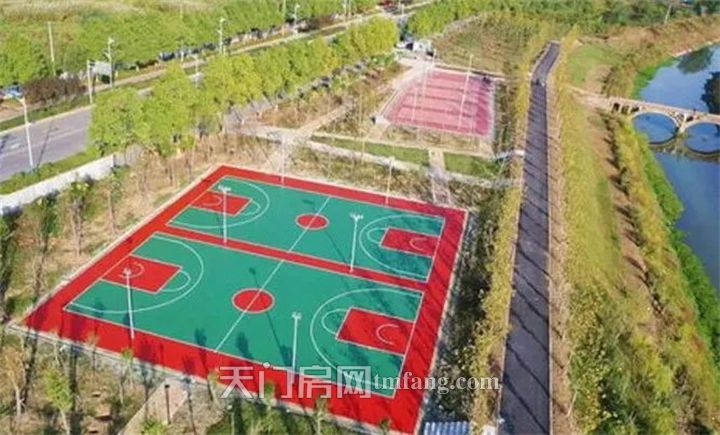 天门市杨家新沟绿化改造工程,在义乌路东侧、杨家新沟北侧布置了健身公园,内设了户外篮球场、羽毛球场、乒乓球场以及户外健身设施。并结合景观改造在杨家新沟两侧布置了健身步道和自行车道。