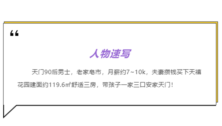 从去外地上学到毕业后的异地恋,经历了多年闯荡依然无依无靠,两人终于决定结婚后一起回老家城区,在天门发展热区城东方向,万达广场附近,选择了性价比很高的天禧花园,买下了建面约119.6㎡的舒适三房,带着孩子一起定居天门,开启了家乡的精彩舒居生活!