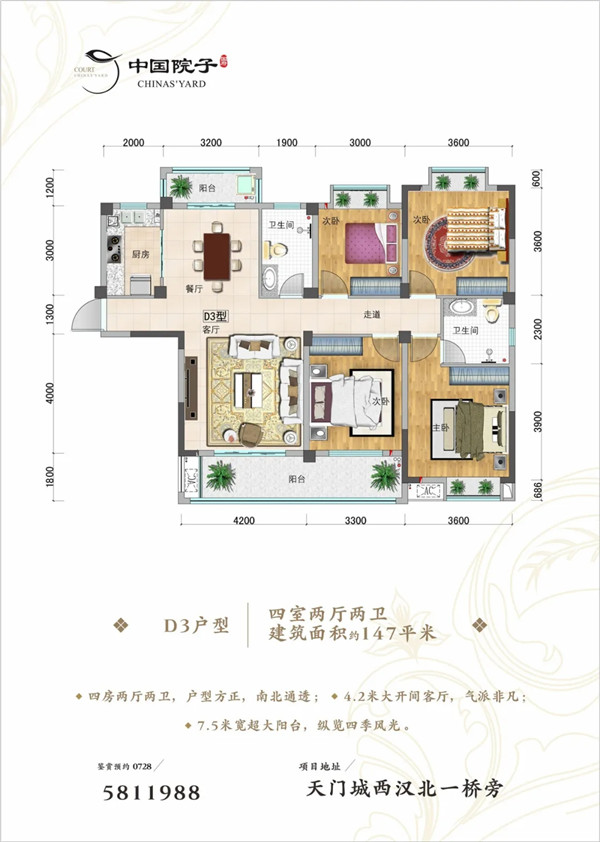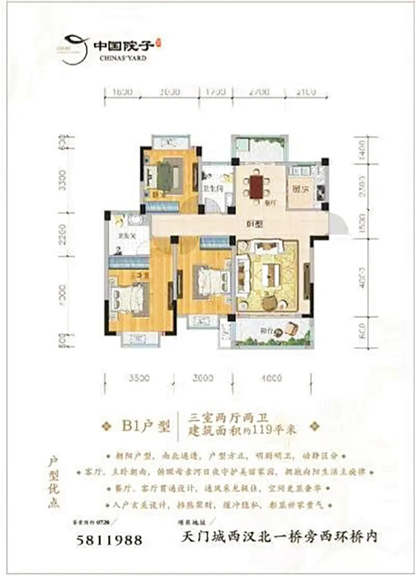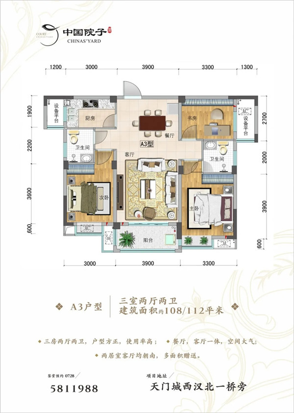 中国院子包含5栋住宅,总高15到17层,层高3米,均为两梯三户。楼栋之间布局合理,楼间距大,通风采光俱佳,108~148平户型方正,南北通透,明厨明卫,宽大阳台,美景尽享。