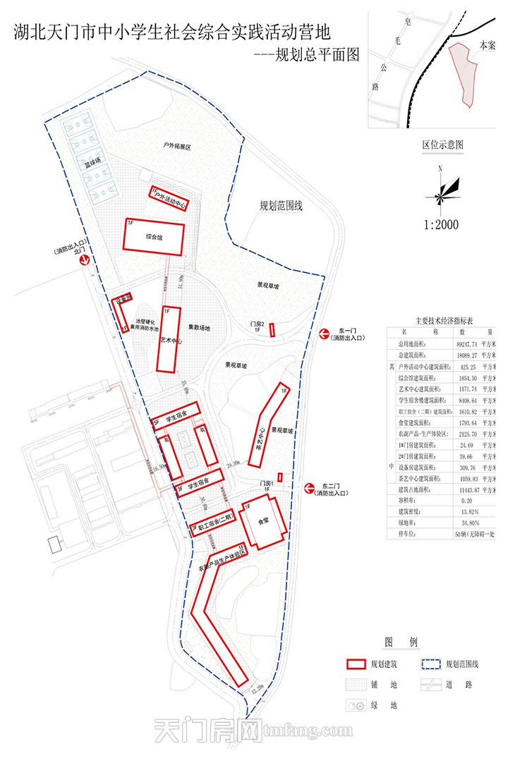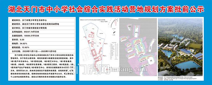 天门市青少年学生活动中心申报的湖北天门市中小学社会综合实践活动 营地项目,位于皂毛公路东侧。规划拟新建12栋建筑及相关配套设施,其中 1栋1层户外活动中心,1栋1层综合楼,1栋1层艺术中心,1栋1层设备房, 1栋5层、2栋4层、1栋3层学生宿舍楼,1栋3层职工宿舍,1栋1层食堂,1栋 1层农副产品生产体验区,1栋1层茶艺中心。该项目总建筑面积为18089.27平 方米,容积率为0.20,具体详见规划总平面图和效果图。经我局审查,拟同 意批准该项目规划方案,现将拟批准的规划总平面图予以公示。有关单位或 个人如对此规划有异议,请在公示期间向皂市分局提出书面异议书。