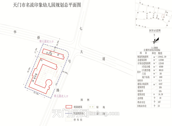 湖北文慧教育产业园开发有限公司申报的天门市名流印象幼儿园项目,位于北湖华侨大道与七号路交汇处,规划拟新建1栋3层教学楼和1栋4层综合楼。该项目总建筑面积为12700平方米,计容总建筑面积为12540平方米,容积率为0.9,日照分析满足规范要求,具体详见规划总平面图、日照分析图和效果图。经天门市自然资源和规划局竟陵分局审查,拟同意批准该项目规划方案,现将拟批准的规划总平面图予以公示。有关单位或个人如对此规划有异议,请在公示期间向竟陵分局提出书面异议书。