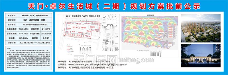 卓尔城(天门)投资有限公司申报的天门 · 卓尔生活城(二期)项目,位于经三路与星星大道交汇处。规划拟新建 22 栋建筑及相关配套设施,其中 25 #一 36 #楼为 27 层住宅, 37 #、 38 #楼为 27 层住宅(含1层商业裙楼),项目南部规划建设 8 栋 2 层商业。项目总建筑面积为 397790 . 55 平方米,计容总建筑面积为 323326 . 23 平方米,容积率为 2 . 738 。日照分析显示部分户型不满足 2 小时 30 分钟日照时间,具体详见规划总平面图、日照分析图和效果图。经我局审查,拟同意批准该项目规划方案,现将拟批准的规划总平面图予以公示。有关单位或个人如对此规划有异议,请在公示期间向市自然资源和规划局提出书面异议书。
