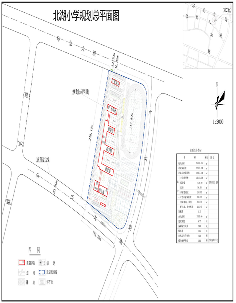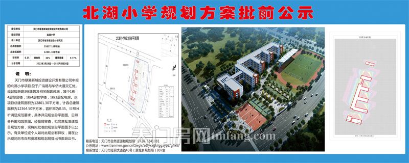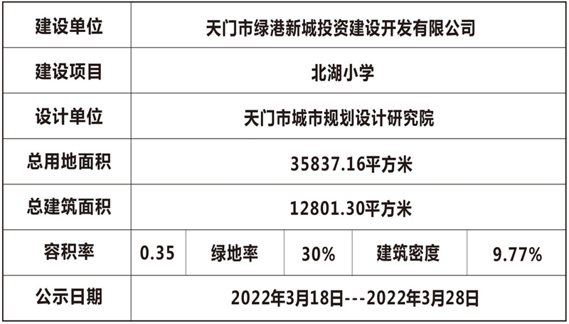 天门市绿港新城投资建设开发有限公司申报的北湖小学项目,位于广沟路与华侨大道交汇处。规划拟新建3栋建筑及相关配套设施,其中1栋4层综合楼,1栋4层教学楼,1栋1层配电房。该项目总建筑面积为12801.30平方米,计容总建筑面积为12364.50平方米,容积率为0.35,日照分析满足规范要求,具体详见规划总平面图、日照分析图和效果图。经我局审查,拟同意批准该项目规划方案,现将拟批准的规划总平面图予以公示。有关单位或个人如对此规划有异议,请在公示期间向市自然资源和规划局提出书面异议书。